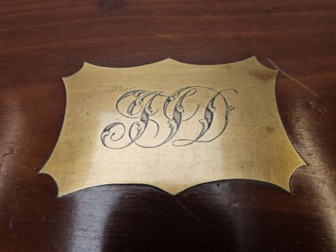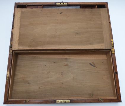 A 19thC brass inlaid mahogany writing slope with tooled leather writing slope, full length drawer below and campaign style handles, length 56cm
