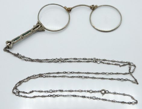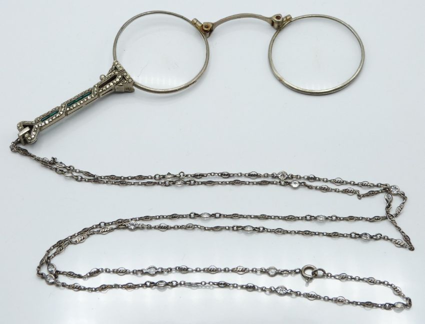 White metal lorgnettes set with marcasite and paste and a silver chain/ necklace set with paste, 35g