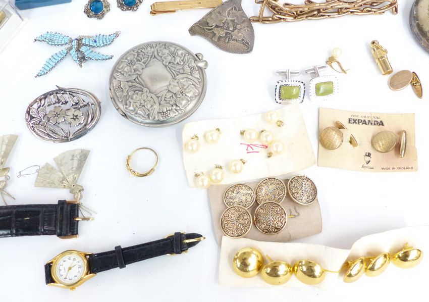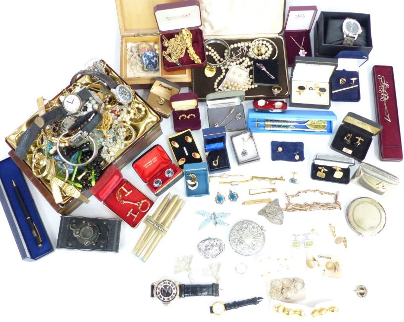 A collection of costume jewellery, some silver including filigree brooch, rings, necklaces, chain etc