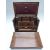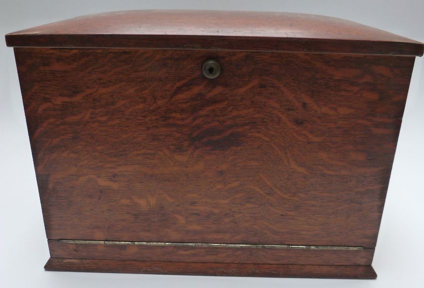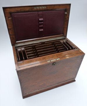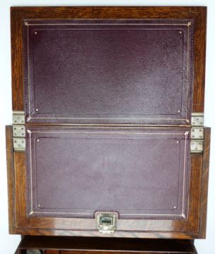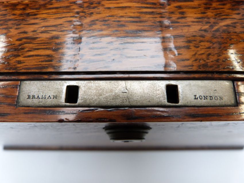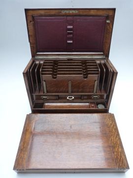 Oak travelling writing slope and stationery box with Bramah lock, the double fold out slope opening to reveal fitted interior and tooled leather writing slope, width 37cm