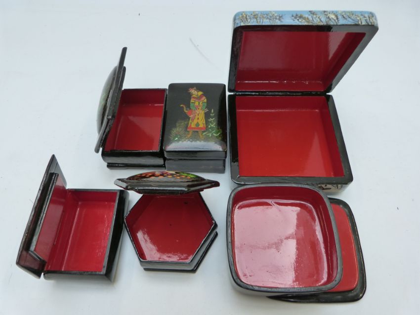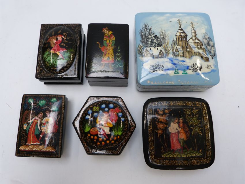 Six Russian lacquer boxes, including signed examples, largest 9.5 x 9.5cm