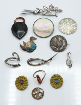 Eight silver brooches, silver ring, Victorian vinaigrette and tortoiseshell padlock. 91.4g.