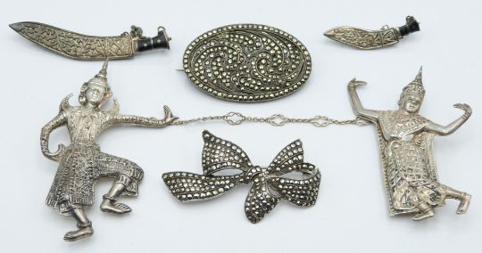 Two Siam silver brooches depicting deities, a silver pendant depicting a mask, white metal knife brooches, two silver and marcasite brooches and a silver necklace and two pairs of silver earrings all set with marcasite, 93g