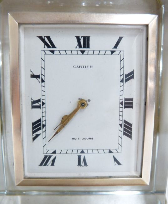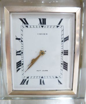 Cartier crystal cased clock with Roman ivory coloured dial, the eight hour keyless movement stamped 4864, in original fitted embossed leather covered case, H10.5cm