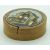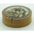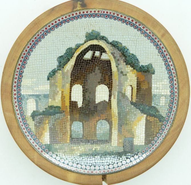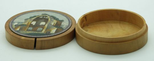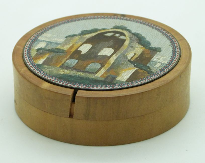 Micromosaic lidded turned wood grand tour circular patch box depicting a ruined building / abbey, the box possibly laburnum or olive wood, diameter 7.5cm, height 2.5cm