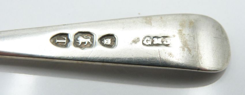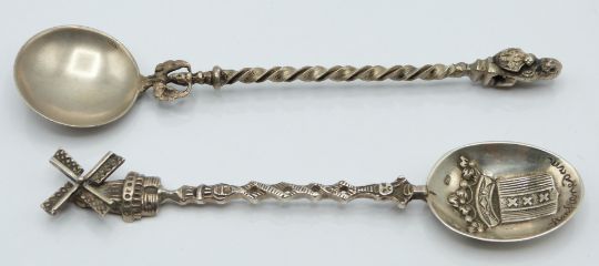 Set of four hallmarked silver teaspoons with shell bowls, hallmarked silver fork and a white metal spoon marked 800, weight 92g, American Eagle 1999 silver dollar coin and a windmill topped spoon