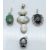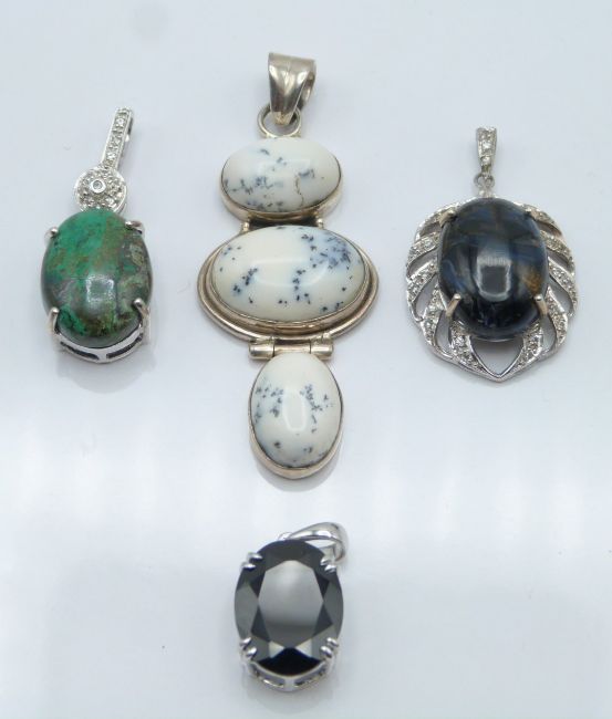 Seven silver pendants set with chrysocolla & zircon, pietersite & topaz, black spinel, two agate, rhodocrosite and unakite