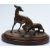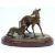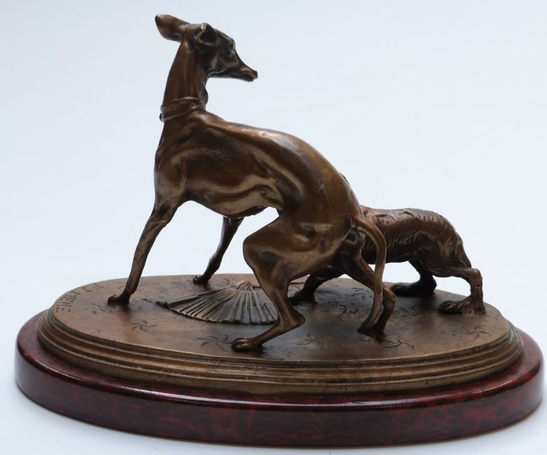Cast bronze or similar pair of dogs with fan on the floor below, marked P.J. Mene to base, on a ceramic marble effect base, H18 x L26cm