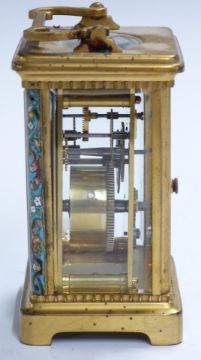 Late 19th/ early 20thC French brass cased carriage clock with enamel decoration to corniches, Arabic dial with floral and foliate decoration, H11cm