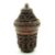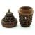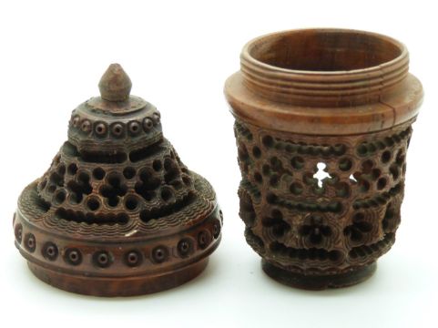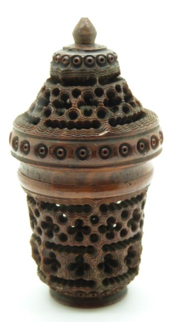 19thC treen carved and pierced Coquilla nut pedestal pomander or cricket cage with screw top, decorated with an architectural pierced design, possibly North African, height 8.2cm