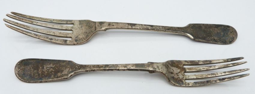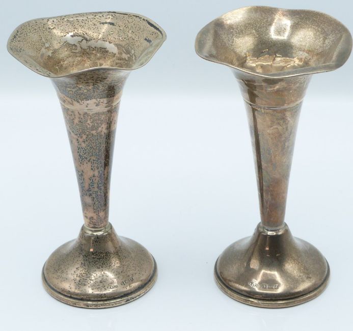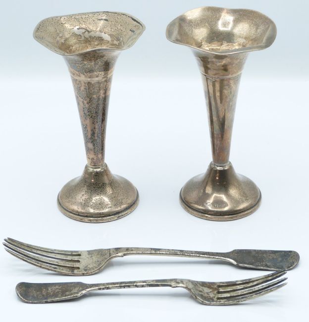 Pair of hallmarked silver trumpet or spill vases, Birmingham 1972 maker W I Broadway & Co, height 13.5cm, together with two Victorian hallmarked silver fiddle pattern forks, one dinner one dessert, length of longer 20cm, weight of both 108g