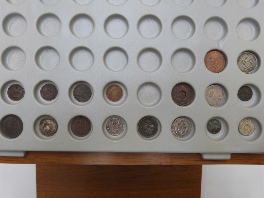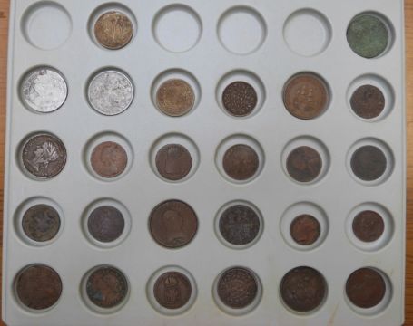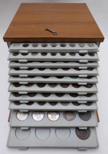 An amateur coin collection of 18thC and 19thC world coinage contained in a 1970s ten-tray lockable coin cabinet, some silver content