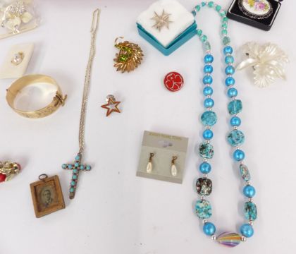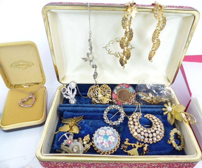 A collection of costumer jewellery including vintage brooches, silver cat brooch, silver necklace etc