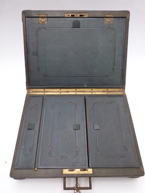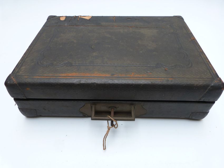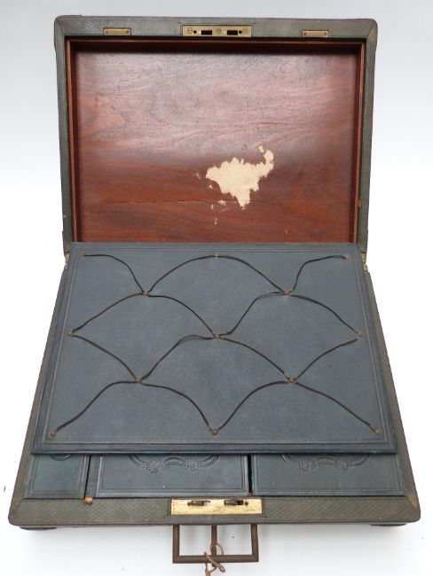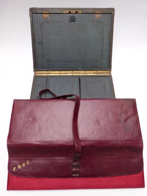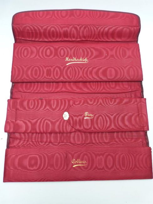 Red leather silk lined travelling valet case marked with gilt script, handkerchiefs, ties and collars, width 49cm and a leather travelling case with tooled leather fitted interior and Bramah lock, width 36cm