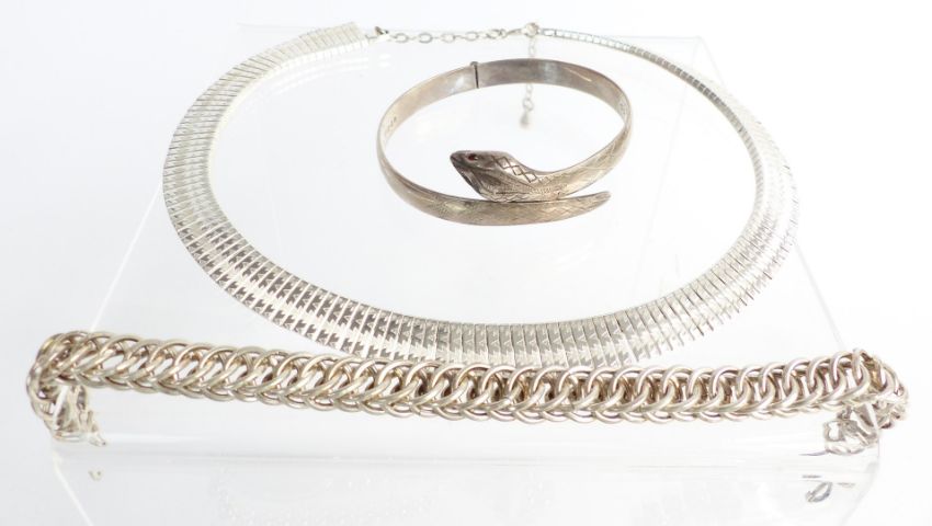 A collection of costume jewellery including four silver rings, vintage ring box, 9ct gold clip, silver snake bangle, silver necklace and bracelet, etc