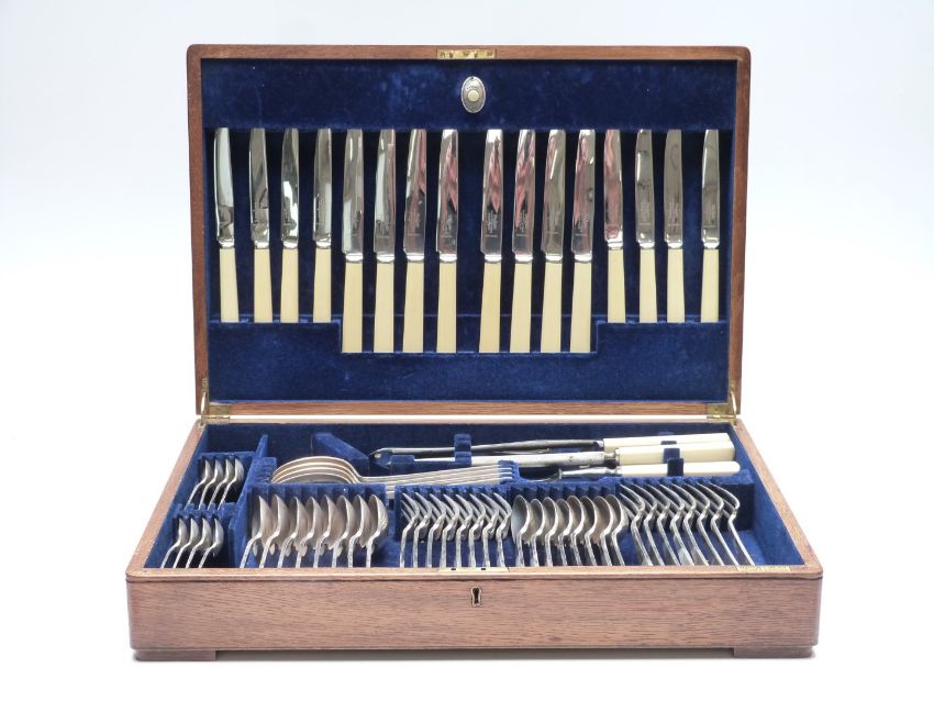 Mappin & Webb Art Deco eight place setting canteen of silver plated cutlery, width of oak case 50cm