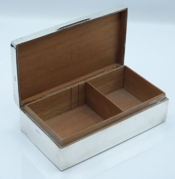 Walker & Hall hallmarked silver cigarette box, Sheffield date letter rubbed, with military interest inscription to lid to Thomas Douglas Fisher DSO MC, width 17cm