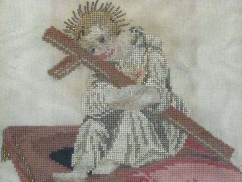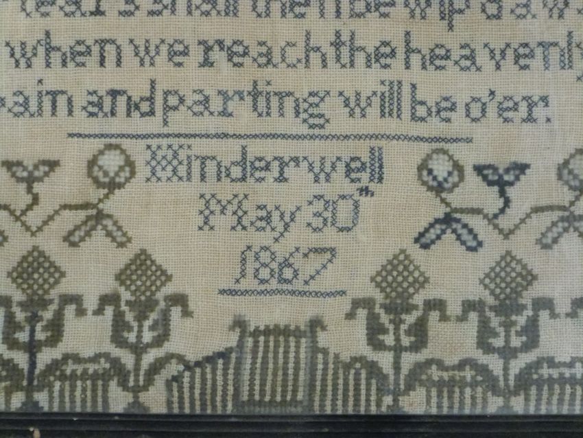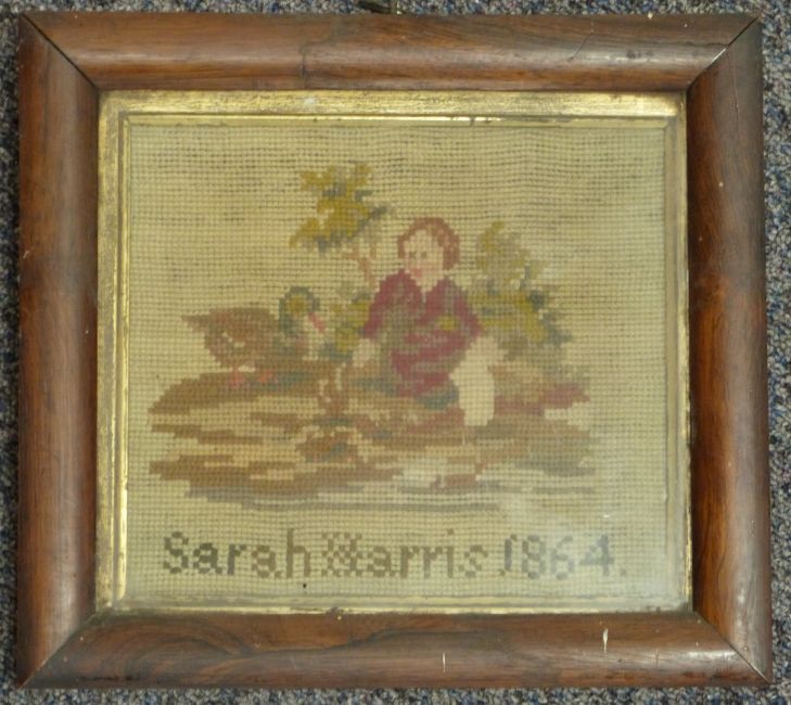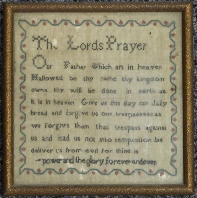 Four Victorian embroidery samplers including The Lord's Prayer and another by Sarah Harris 1864, largest 29 x 26cm