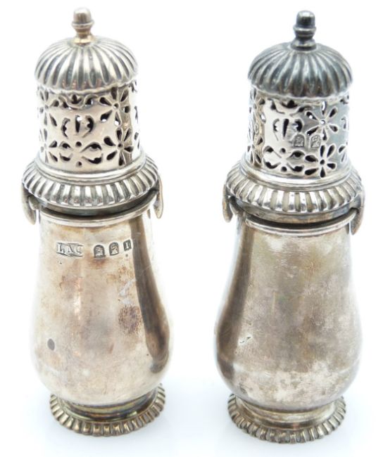Pair of Chrichton Bros Britannia standard hallmarked silver peppers in the Georgian style, London 1926, height 8.5cm, weight 134g