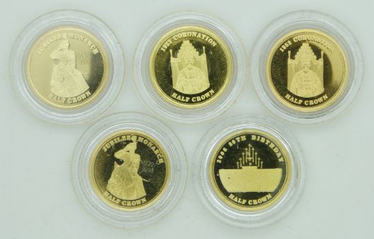 Windsor Mint five limited edition miniature gold coins, commemorating the Queen's Jubilee / Coronation etc, each 1g, in original boxes no certificates