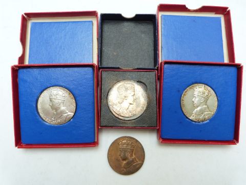 Two cased silver George V commemorative medallion coins, a bronze example and a Elizabeth II Coronation souvenir medal coin