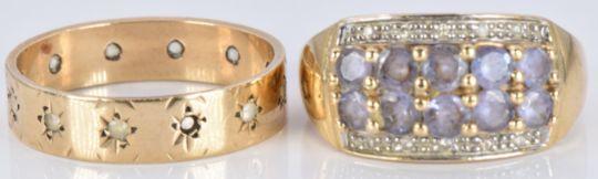 A 9ct gold ring set with amethysts and diamonds and a 9ct gold ring set with paste, 6.3g, sizes L/M and P