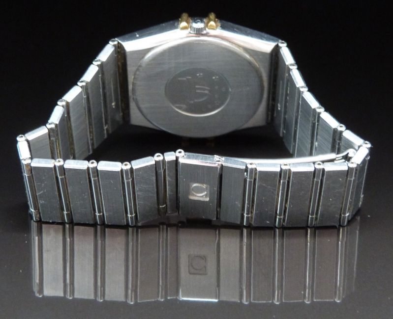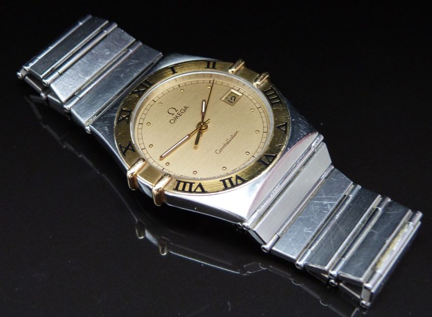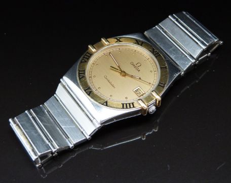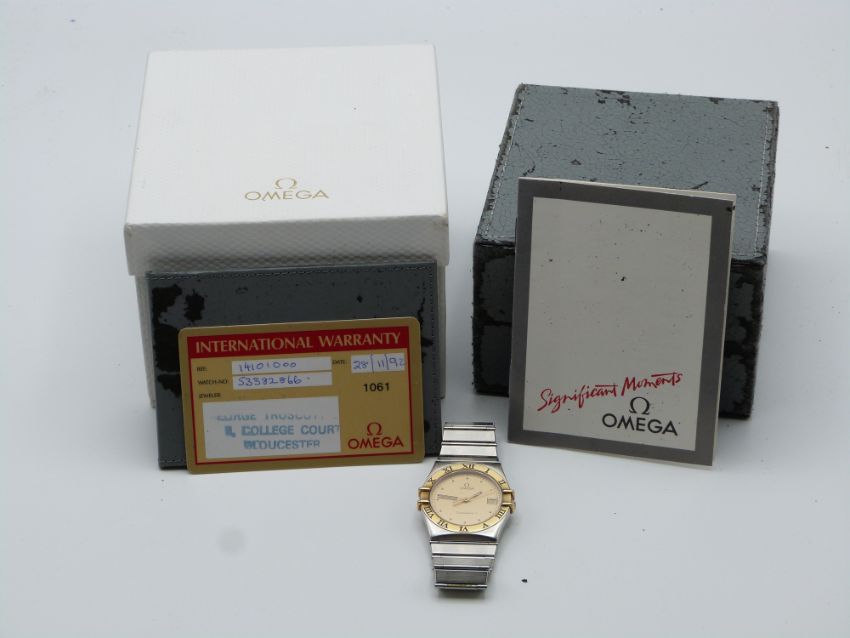 Omega Constellation wristwatch ref. 1410.10.00 with date aperture, luminous and gold hands, gold dot markers and dial, black Roman numerals to the gold bezel, stainless steel case and signed calibre 1424 quartz movement, on stainless steel bracelet, case diameter 30mm, serial number 53382866, in original box with international warranty card, related paperwork, spare links and outer box