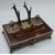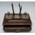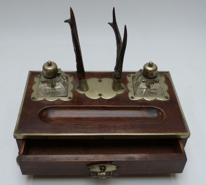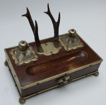 A 19th/20thC oak standish or desk stand with plated mounts, antler pen stand and cut glass inkwells, W31 x D17 x H22cm