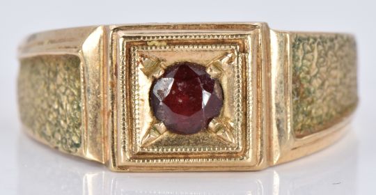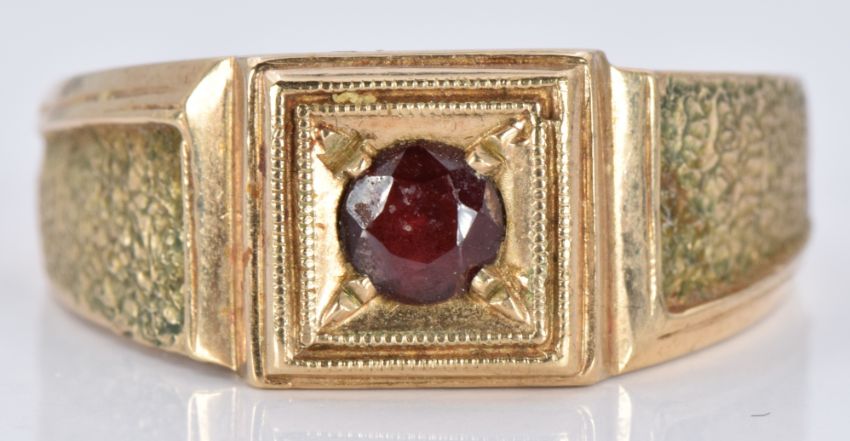 A 9ct gold signet ring set with a garnet, 6.8g, size T