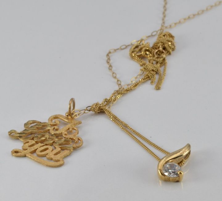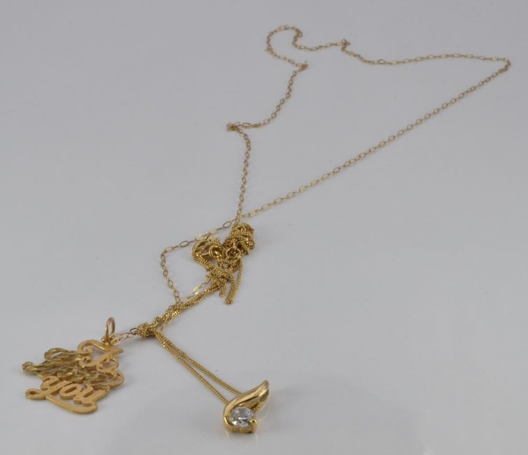 A 9ct gold necklace and pendant together with a 9ct gold 'I Love You' pendant, 2.3g