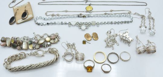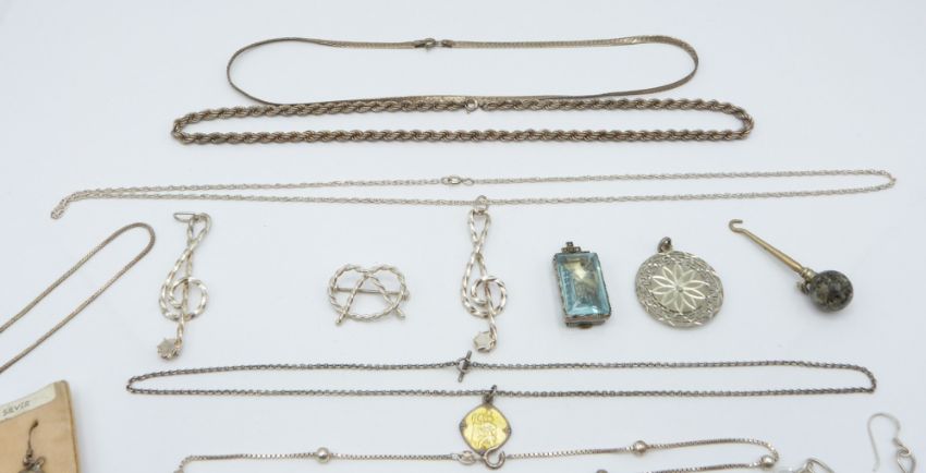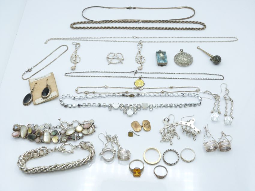 A collection of silver jewellery including silver chains, bracelet, earrings, enamel St Christopher, silver ring, Art Deco clip, etc (82g)