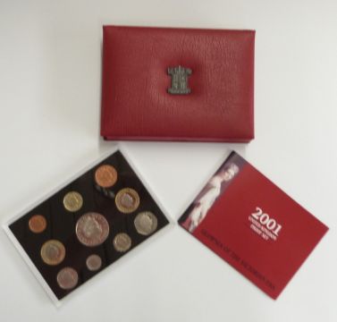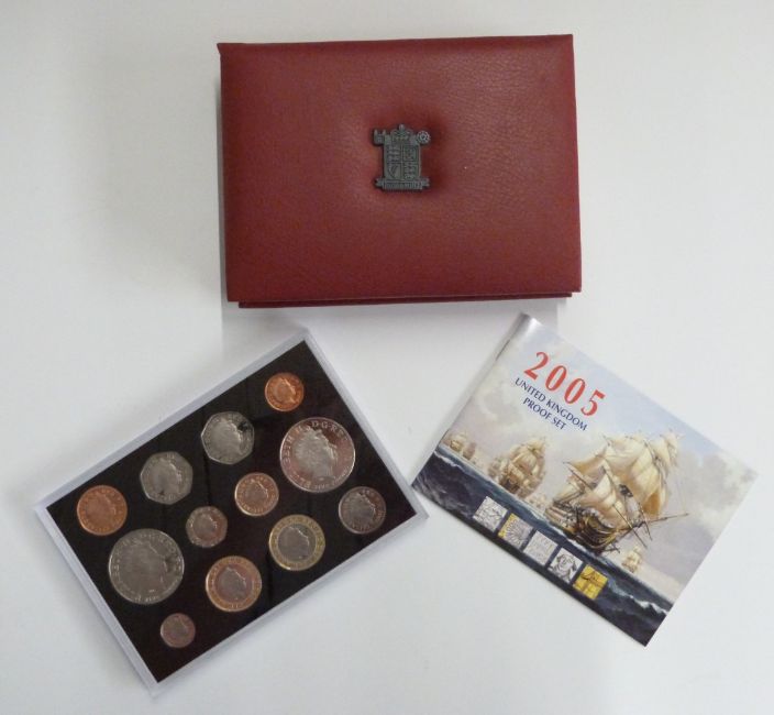 Four Royal Mint proof deluxe coin sets, 2001, 2004, 2005, and 2006, with certificates