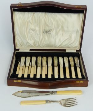 George V 12 place setting hallmarked silver ivory handled fish eaters, Sheffield 1925 maker Cooper Brothers & Sons Ltd, in original case, together with a similar pair of fish servers, Sheffield 1919 maker John Sanderson & Son Ltd, weight 885g all in