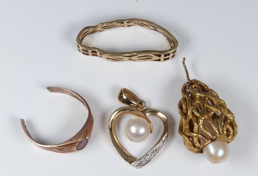 A pair of 9ct gold earrings, a 9ct gold pendants, 10.4g