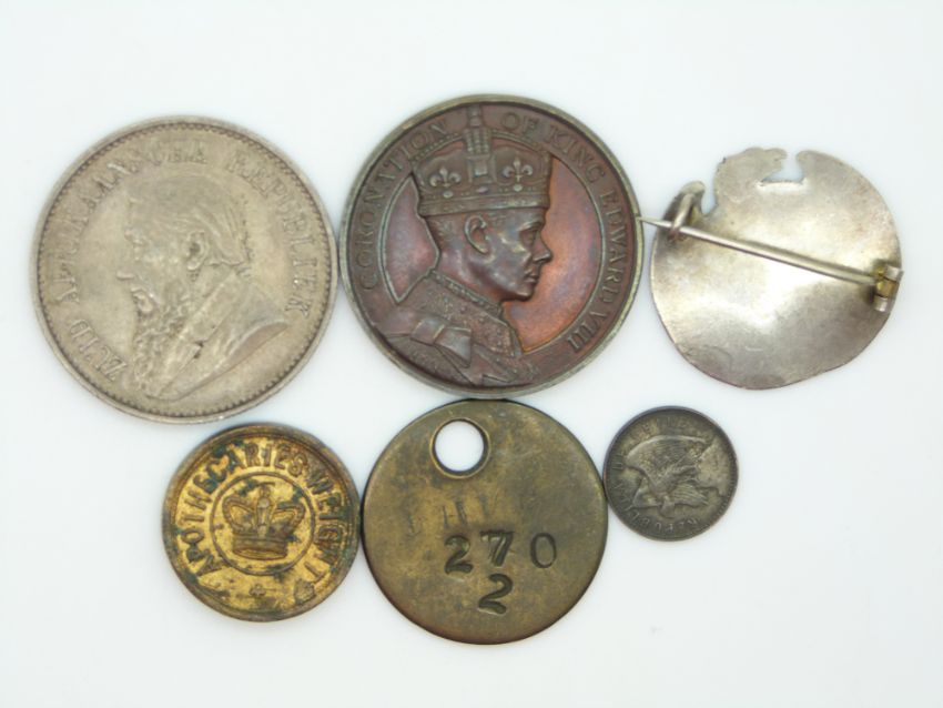 Edward VIII bronze 30mm coronation medal coin, an 1897 South African 2 1/2 shillings, Chile Republic cinco centavos 1908, a two drachm apothecary's weight and a silver coin brooch, possibly young Prince Albert etc