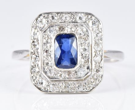 Art Deco platinum ring set with an oval cut sapphire surrounded by two tiers of diamonds, 3.2g, size O