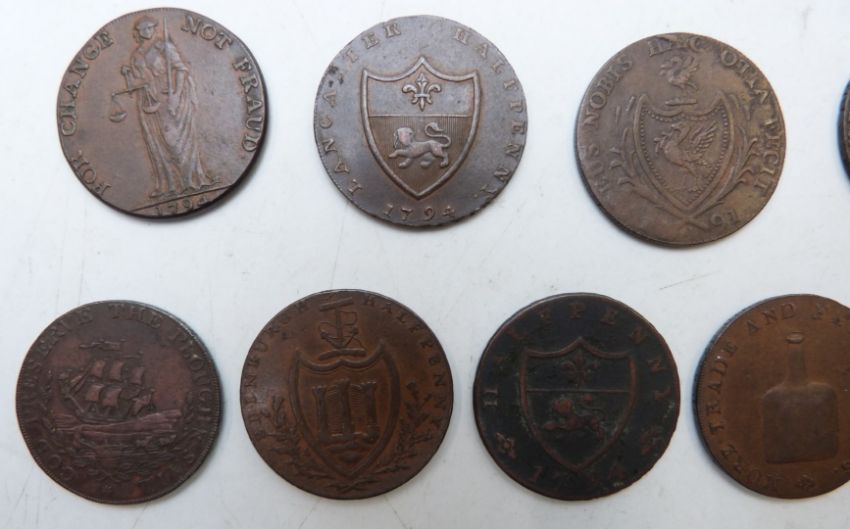 Eleven 18thC British Conder tokens / trade halfpennies to include Hastings, Liverpool, Yarmouth, Edinburgh, Wales, Lancaster, Shrewsbury, Bungay, mottos etc