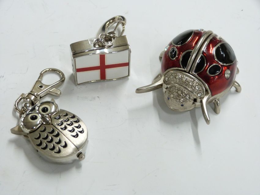 A collection of novelty miniature clocks in the form of Teddy bears etc, together with further examples in the form of keyrings