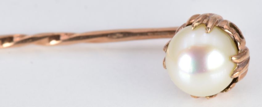 A 9ct rose gold stick pin set with a pearl, in vintage box