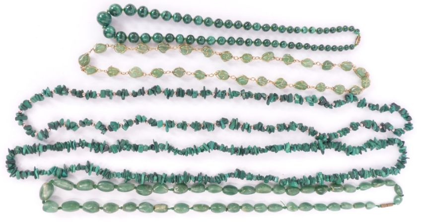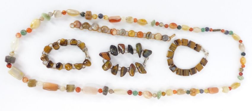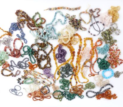 A collection of hardstone necklaces including rose quartz, tiger's eye, pressed amber, malachite etc