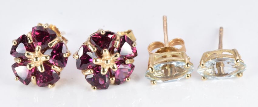 A pair of 9ct gold earrings set with five trilliant cut rhodolite to each and a pair of 9ct gold earrings set with marquise cut aquamarines