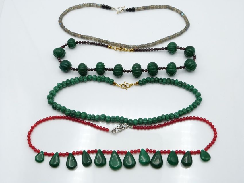 A labradorite necklace, jade and quartz necklace, garnet and quartz and another quartz necklace