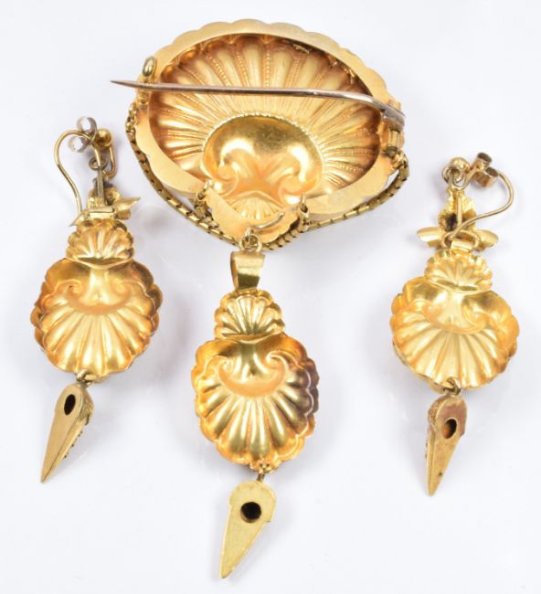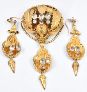 Victorian Etruscan Revival yellow metal cased brooch (W- 3.5cm x L- 7cm) and earrings set with foiled aquamarines (W- 0.5cm x L- 5cm), in original box, 10.4g