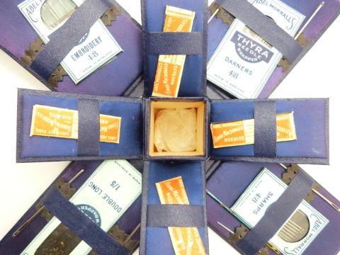 An early 20thC needle box with fold out sections and named Abel Morrall's needles within, W7 x D7 x H11cm