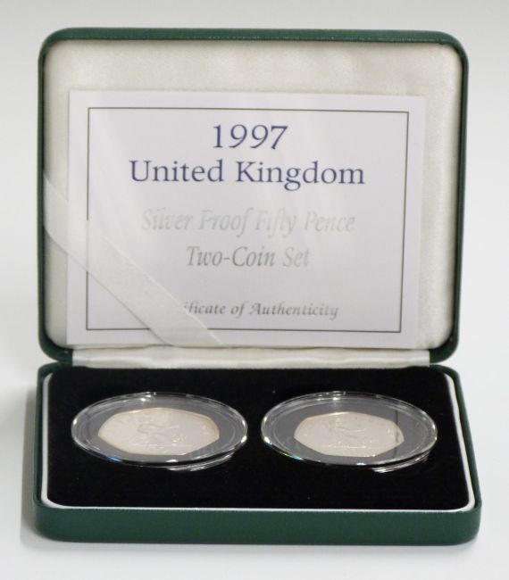Royal Mint 1997 UK Silver Proof 50p Two-Coin Set, cased with certificate