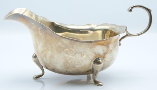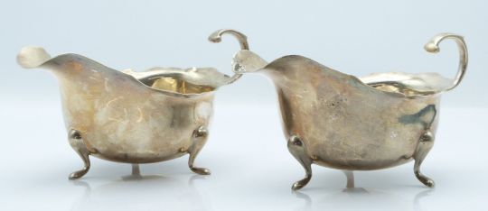 Pair of George VI hallmarked silver sauce boats raised on three feet, Birmingham 1939/40 maker Adie Brothers Ltd, length 17cm, weight 282g