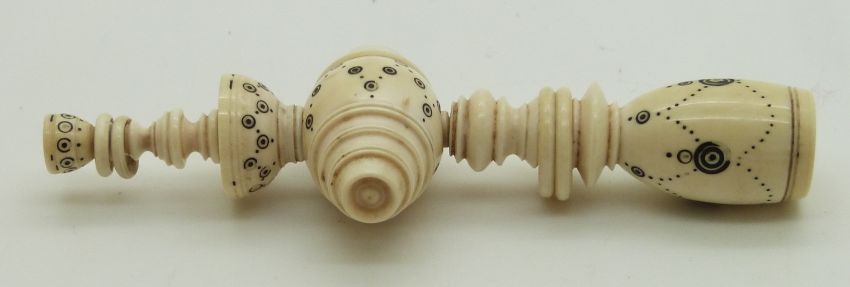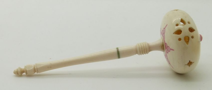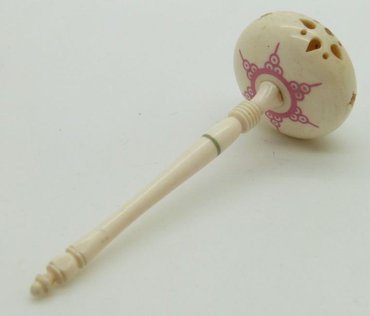Two 19thC Indian Madras ware ivory baby's rattles, longest 9.5cm
