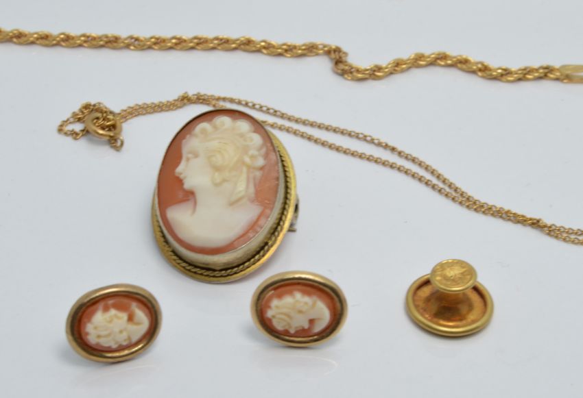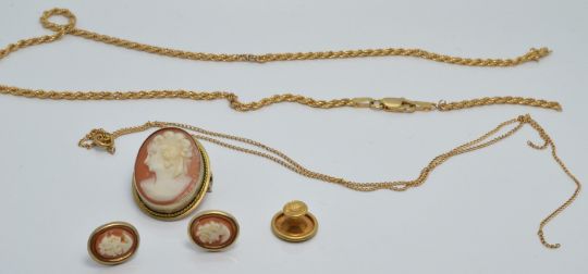 A 9ct gold chain, 9ct gold rope twist necklace (6g), 18ct gold stud (0.7g) cameo brooch and earrings