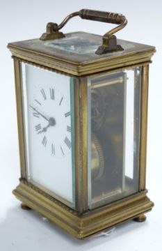 Brass carriage clock with Roman enamelled dial, corniche corners to case and movement stamped 'Made in France', H12cm