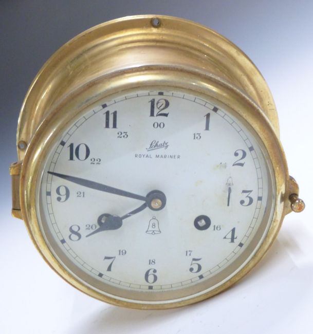Shatz Royal Mariner brass ship's bulkhead clock, eight day movement striking on a bell, together with a matching dial compensated precision barometer with 13cm dial